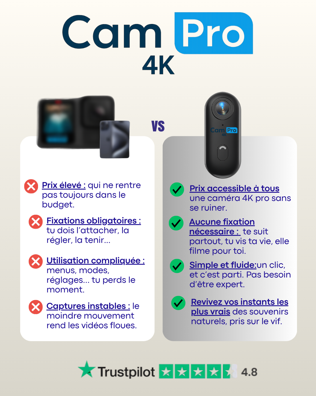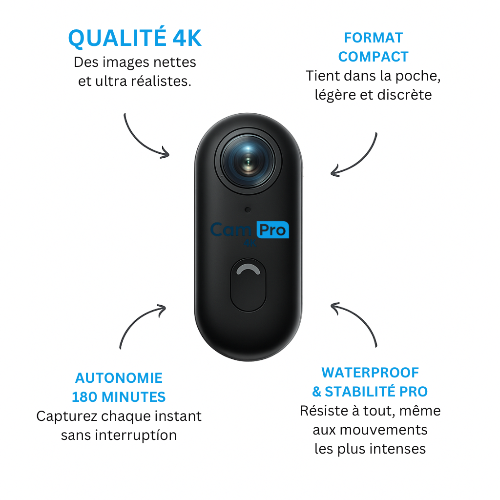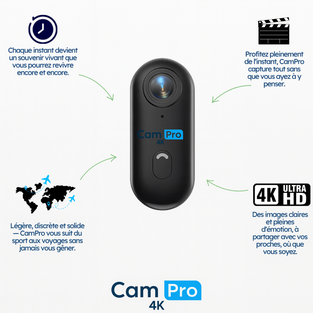 Avec la qualité 4K de CamPro, chaque image devient un souvenir vivant. Vous ne regardez plus une simple vidéo — vous revivez vos émotions, vos rires, vos sensations.